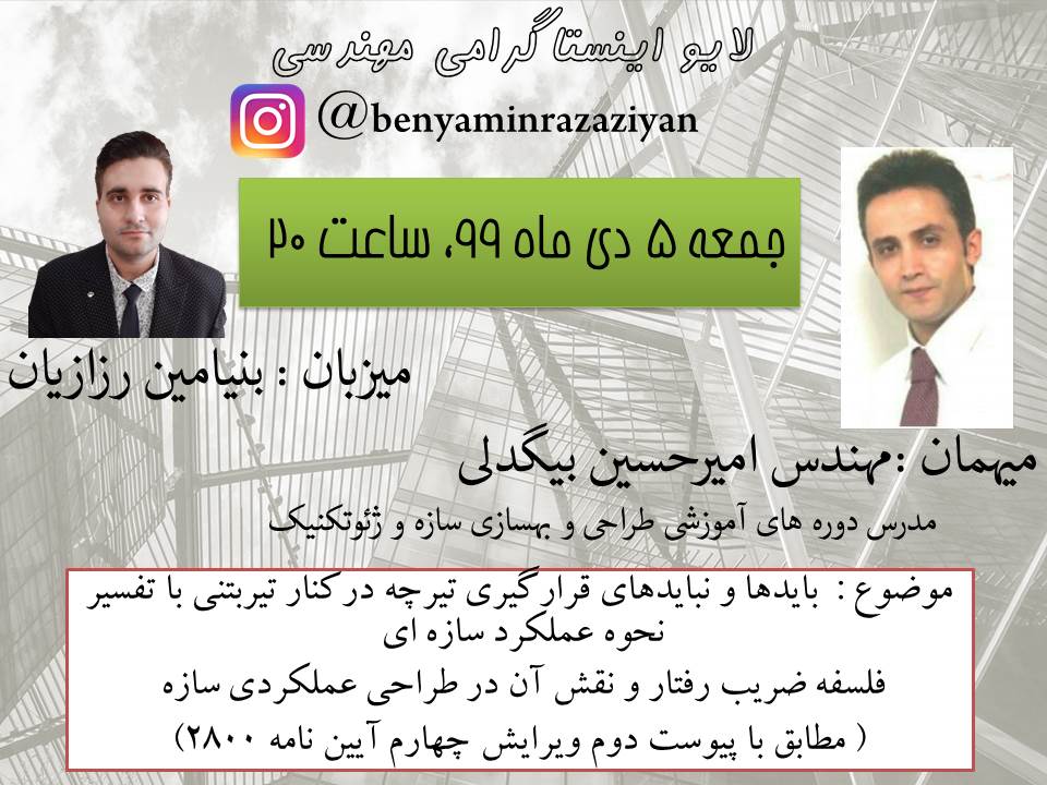 لایو اینستاگرامی 5 دی ماه 99، ساعت 20 ۰۴ دی ۱۳۹۹ بنیامین رزازیان ، تیرچه بایدها و نبایدهای قرارگیری تیرچه درکنار تیربتنی با تفسیر نحوه عملکرد سازه ای وفلسفه ضریب رفتار و نقش آن در طراحی عملکردی سازه ( مطابق با پیوست دوم ویرایش چهارم آیین نامه 2800)