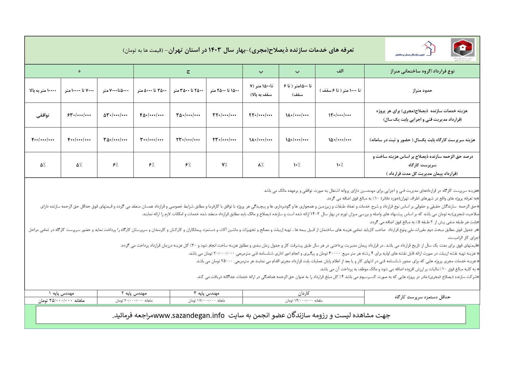 تعرفه خدمات سازنده ذیصلاح (حق الزحمه مجری) ساختمان بهار و پاییز 1403 -بهار 1404 استان تهران ۰۳ خرداد ۱۴۰۳ تعرفه مجری ذیصلاح ، تعرفه مجری استان تهران ، تعرفه مجری ذیصلاح 1403 ، تعرفه خدمات سازنده ذیصلاح (مجری) ساختمان بهار 1403 ، تعرفه مجری ، تعرفه مجری پاییز ۱۴۰۳ ، حق الزحمه مجری ۱۴۰۳ ، حق الزحمه مجری ۱۴۰4 ، تعرفه مجری 1404